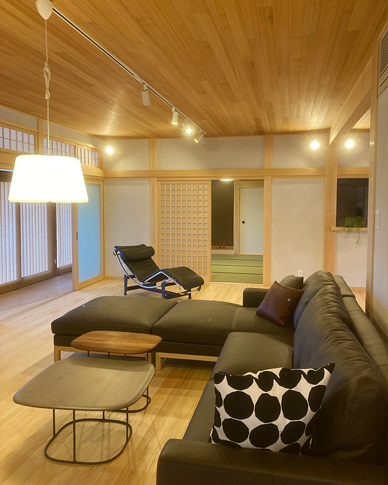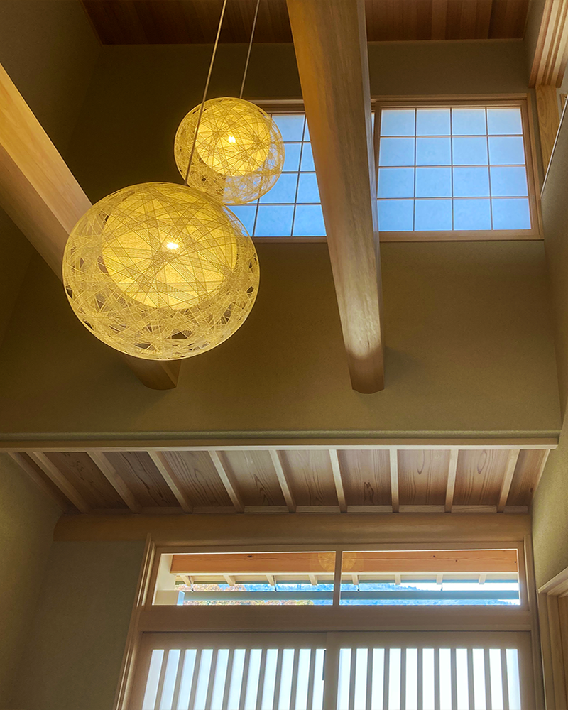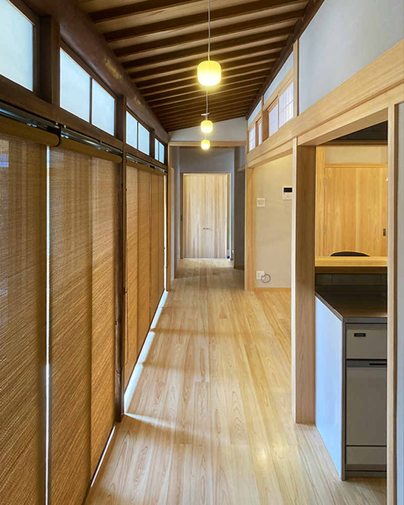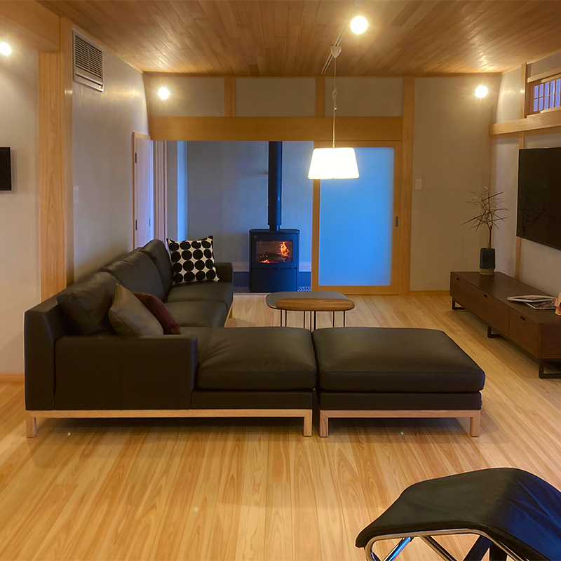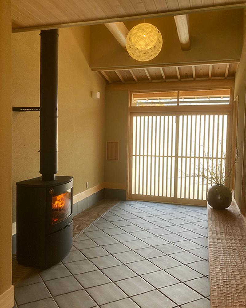 通り土間に暖炉があり親子がゆくっりと過ごせる空間が特徴的な住宅。